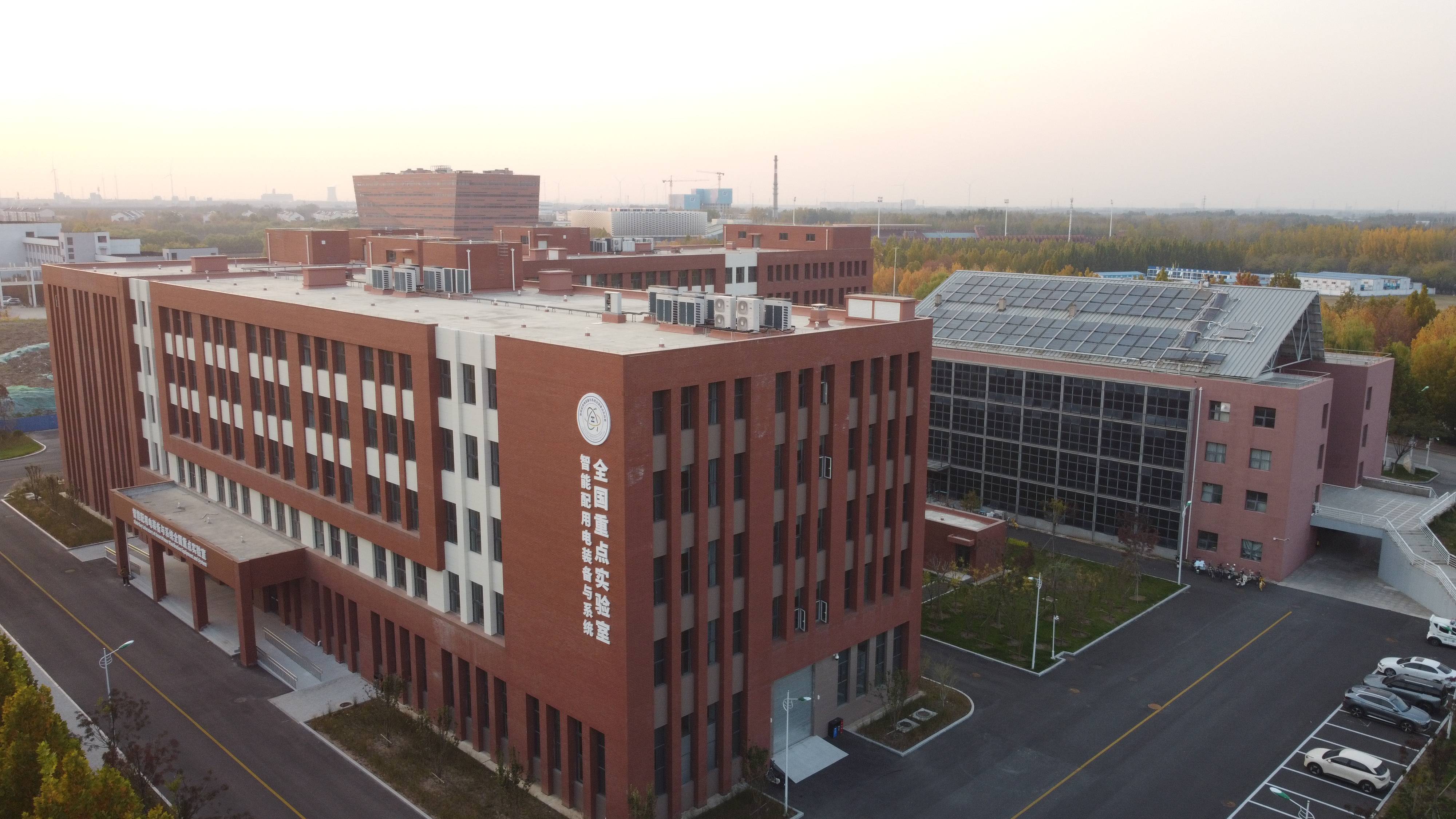 建筑平面呈“Z”字形布置,南面五层和北侧的一层为国家重点实验室(用作省部共建电工装备可靠性与智能化国家重点实验室),中间部分为教学实验用房。建筑风格简洁、整齐、富有现代感。建筑外立面以砖红色装饰砖为主,局部采用深咖色外墙点缀,色调统一,庄重典雅。建筑外墙大面积采用复合夹心墙体,主要由内侧的加气混凝土砌块,中层的脲醛发泡保温层和外侧的砖红色装饰多孔砖组成,形成外部仿真黏土砖纹理。深咖色外墙为加气混凝土砌块外贴憎水岩棉保温板刷涂料形成。两种不同的纹理,使立面在统一中富有变化,立面风格非常符合校园建筑的属性。